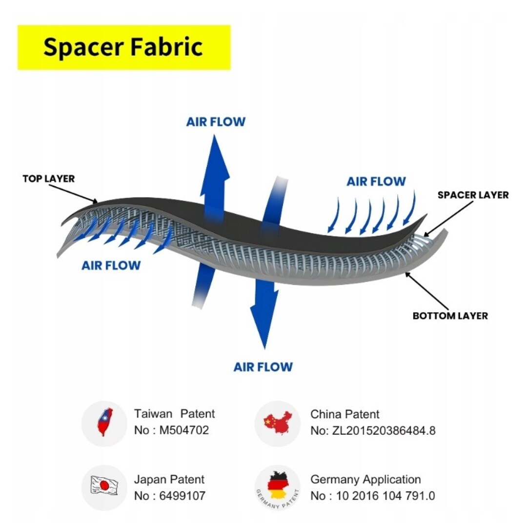Spacer Fabric is 3D breathable, Air Cushion Effect, Machine Washable,24 Hours Use, No Smell, Latex Free, Hypo-Allergenic, Soft Touch, Durable, Light Weight, Easy to Recycle, Anti-Pilling and Quick Dry.