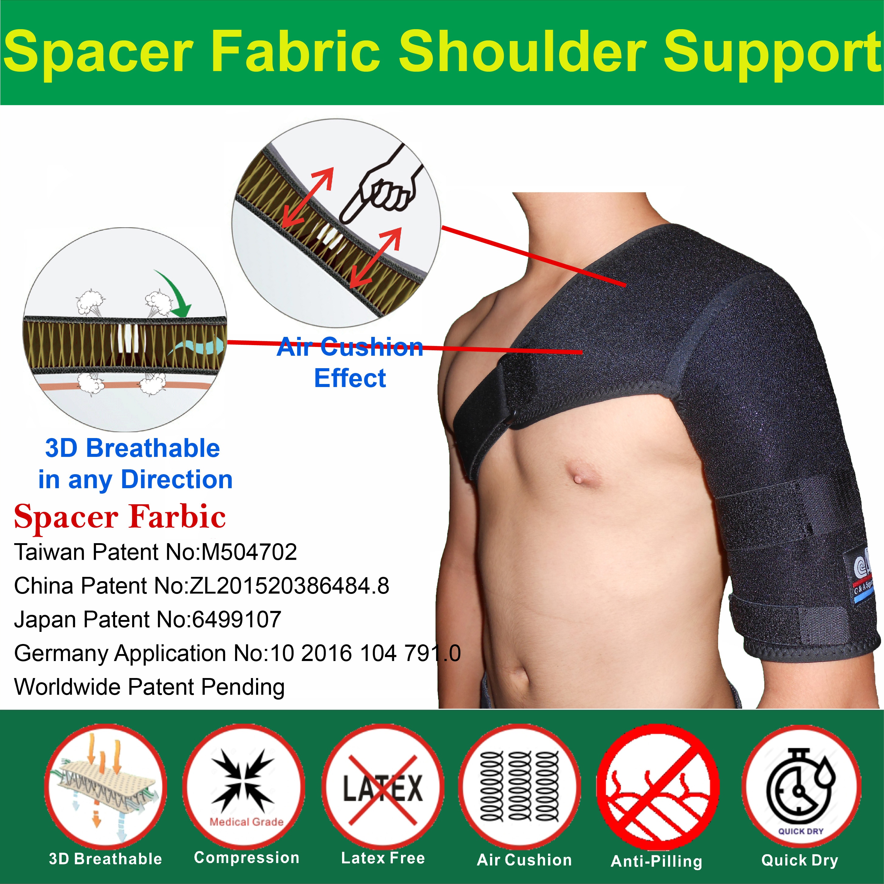 This Shoulder Support is made by Spacer Fabric. Spacer Fabric should be one of the best Sport & Medical Brace material in the world. Only Spacer Fabric has an Air Cushion Effect. Most of the Spacer Fabric in the market does not have enough compression. We Use our patented technique to make Medical Compression Spacer Fabric.